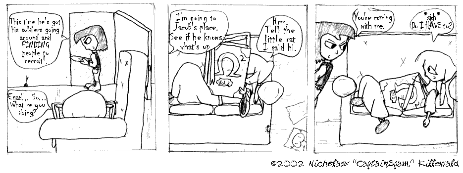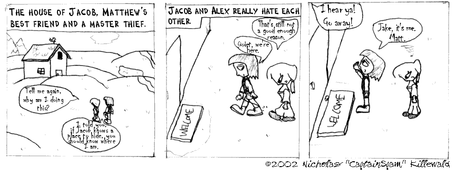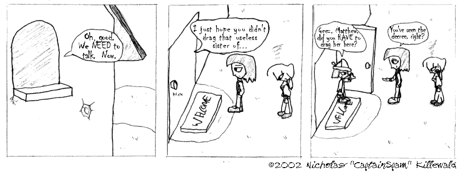 See, when I started this mess, I envisioned being able to swap between full-page comic book-like comics and daily comic strip-like comics any time I felt I could NOT tell a story and break it into evenly spaced punchlines. The opening bits are an example. Sorry, you'll have to put up with this for the first four comics...