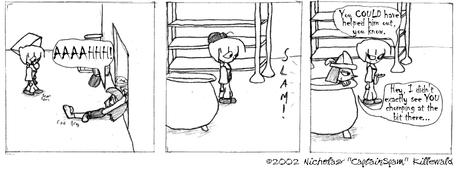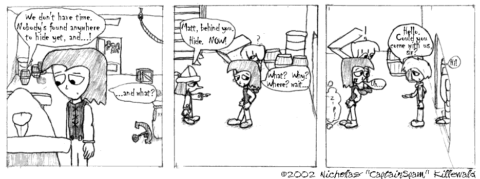 You might wonder why the text looks crowbarred in. I never thought of adding text bubbles AFTER I drew it. Oops. This is fixed once I get out of the opening comics.