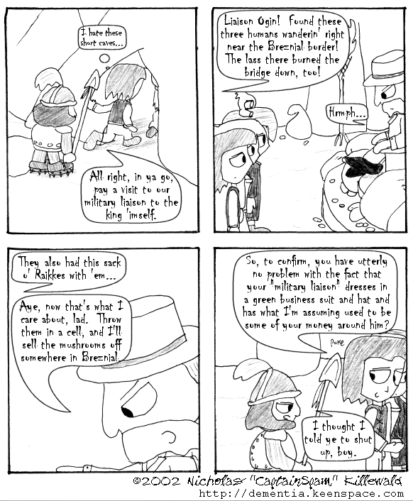 I understand fully that perhaps the pacing of the last few strips seems to be rushing things a bit. I could take the time to try to give more of an impression that Ogin (the liaison) seems to put more importance on personal wealth and greed than anything remotely military-like, that most dwarves aren't like this (in fact, most are fairly generous), and a few other odds and ends.