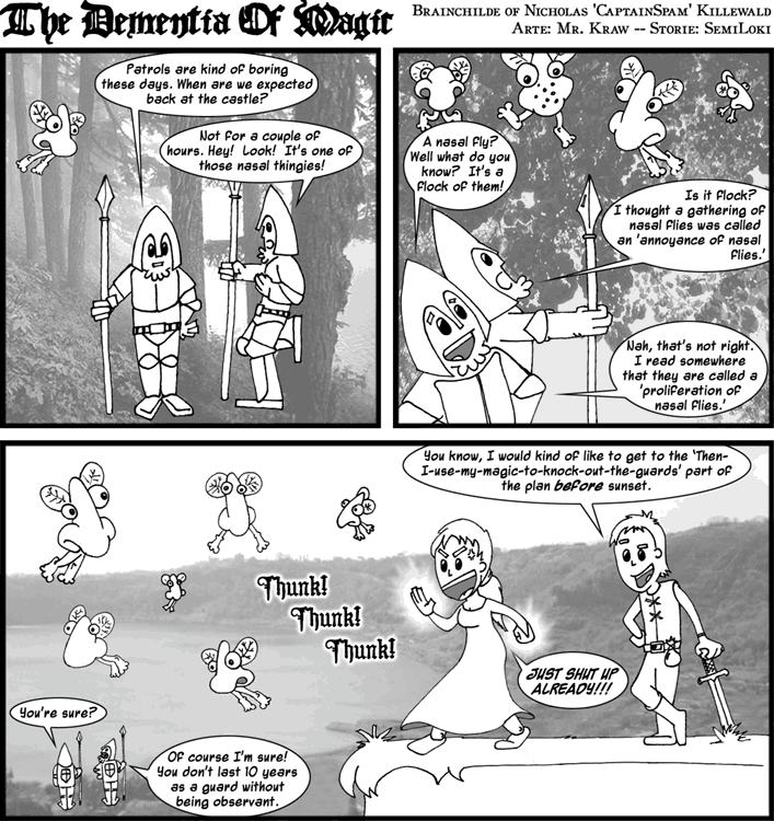 This here strip is by Jesse "MrKraw" Barton. He, unfortunately, has no comic to link to yet, so the best I can do is link you to Really Bad Fiction, which he's going to do something with with a friend; and Ask Dr. Science, the haywire Q&A site he helps run. Anyhoo, this strip is an effort between him and his scriptwriter for a comic he plans to write. Wish 'im luck, I say.