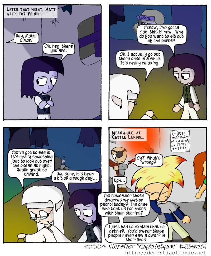 It should be noted that C-Shift's responsibilities are far more reaching than simply inspecting all materials at the start of their shift. C-Shift is also responsible for securing the castle at night and, more often than not, receiving briefing from the preceding shift's patrol captains, in addition to normal patrolling duties common to any shift. But, while Castle Janitorial Services takes care of most cleanup and Blacksmith & Weaponcraft (or, as they are more commonly known to most troops, "Yalro and his Merry Band") takes care of any necessary repairs to materials, inspection of materials at the start of the shift is nonetheless a very vital responsibility for C-Shift.
