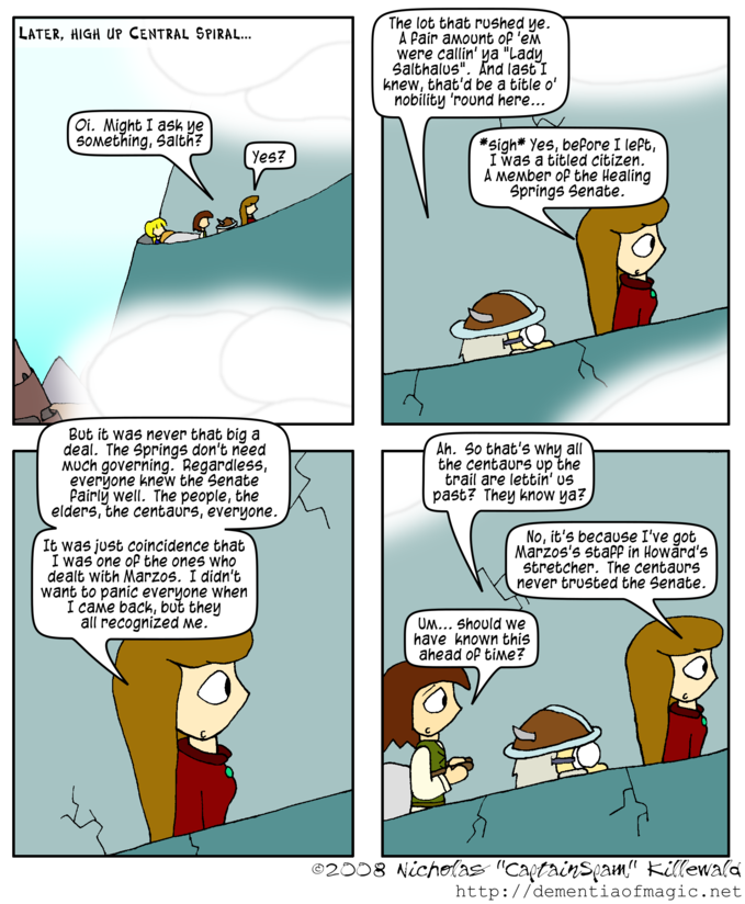 The surrounding area primarily consists of a series of communities carved into spiral walkways going up numerous mountains and rock faces nearby. Five of these spirals — the north, south, east, west, and central ones — are considered the main centers of activity. Each also acts as a gateway to the area from the harsh mountainous regions nearby, with the South Spiral, also known as the Front Spiral, being the most-used, mainly because everybody comes in from the south and nobody really cares about what's in the other directions. Central Spiral, the tallest, contains the actual Springs themselves. And numerous centaurs. And, at present, our main cast.