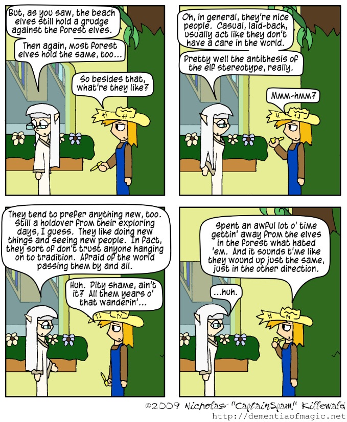 Some readers may note that during the last chapter, a forest elf and a beach elf were seen working together in Lineta Hall without reservation. Those same readers may have guessed that in Lineta Hall, such racism is generally ignored, owing to the slightly more enlightened nature of the people with desires to go there, as well as the large amount of neat stuff to to toy with that, for the most part, lets people forget such petty problems and get to the more important matters at hand, like having fun exploring curiosities and learning. To those readers: You're right, and I can't really add much to that.