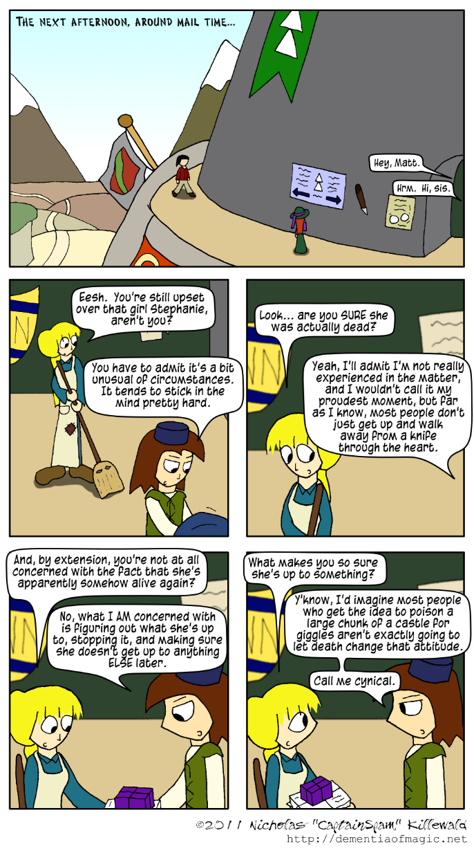 Salth was right, and Matt's not kidding here; Stephanie was, in fact, the first person he has ever been forced to actually kill, a fact of which Matt is not proud at all. Even besides the basic sanctity of life in general, thieves make it a point to avoid killing anyone at all. Not only is it a mark of sloppiness that they were unable to either avoid detection or escape once found, any decent thief understands that dead bodies tend to attract plenty of attention. Regardless of whether or not anyone saw the killer strike, that sort of thing tends to put people a bit on edge. This is sort of counterproductive to someone attempting to sneak away.